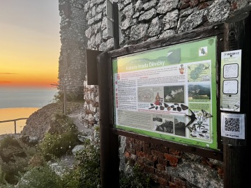 Vyšli jsme z lesa, kde na nás vykoukla zřícenina hradu Děvičky. Prošli jsme po stezce přímo ke zřícenině. Pokochali se výhledem, pročmuchali okolí a pak jsme se usadili a čekali. Byli jsme potichu, protože jsme si všimli, že tam nejsme sami. Byli tam jakési sítě a v nich někdo byl. Panička nám ale zakázala to pročmuchat. Dali jsme si svačinku, panička nám nalila vodu a potichu jsme čekali. A po 20 minutách jsme pochopili, na co se panička tak těšila.