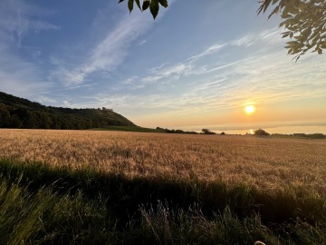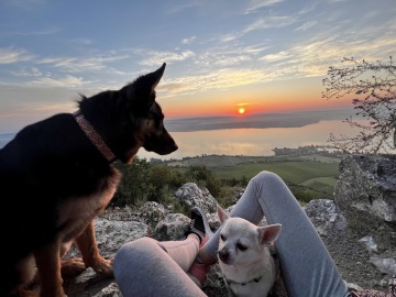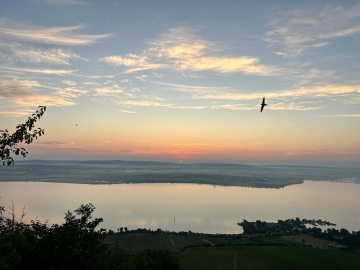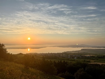 Obloha se začervenala a začalo vycházet slunce. Východ slunce s pohledem na Pálavu a Nové Mlýny - to byla nádhera! Panička jen seděla a kochala se nádherným výhledem.