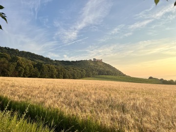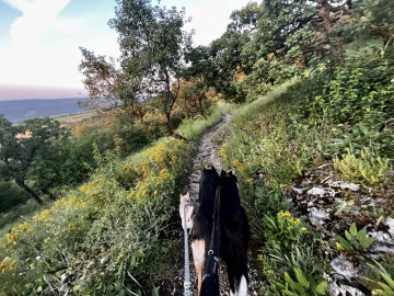 Z náměstí jsme zamířili po zelené stezce do kopečka, prošli jsme pár ulic a ocitli se mezi krásnou vinicí a lesem. V tu dobu nám začal krásně měsíc svítit na cestu a my jsme se vydali do lesa. Cesta byla místy kamenitá, prorostlá kmeny a do kopce. My jsme měli uši v pozoru, potkali jsme pár srnečků, panička nás měla celou cestu na vodítku, tak jsme mohli jen nasávat spoustu různých pachů. Thorinek se chvílemi nesl. Mezitím co jsme čmuchali spoustu nových vjemů, panička si užívala ticho, klid a na ranní hodinu krásně teplý vzduch, to nám bylo taky příjemné. Lepší než těch 30 stupňů co mělo být odpoledne.
