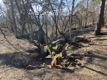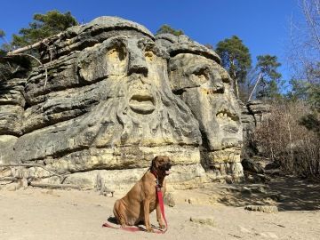 Moje smečka se nějak loudá a musím na ně pořád čekat. Po naší trase jdeme sami, a tak jsem dostala možnost proběhnout se. Netrvalo to dlouho a už vidíme obrovské kameny - to asi budou ty pískovcové skály… a kde jsou hlavy? Děti pořád zdržují, běhají mezi skalami a hrají na schovávanou. Raději je hlídám, ale zlobí se na mě, že je vždycky prozradím.