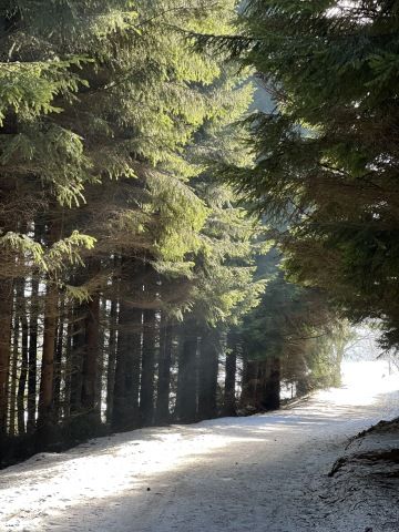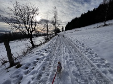 Tentokrát jsme měli namířeno na Dalimilovu rozhlednu. Z parkoviště jsme se doslova prohrabali sněhem na cestu a vyrazili jsme do mírného kopce. My chlupáči jsme si užívali sníh, naháněli se a dováděli ve sněhu jako štěňata. Přijeli jsme pozdě, a tak jsme potkali hodně běžkařů. No, ale co se dalo dělat, vždy jsme se slušně vyhnuli. Stezka byla příjemná a byl hezký výhled, po chvíli stoupání se před námi objevil vchod do lesa. V tu chvíli jsme si připadali, jako když procházíme vchodem do pohádky. Sníh byl všude, stromy byly omrzlé a na nějakých stromech jsme našli i rampouchy, bylo to okouzlující.