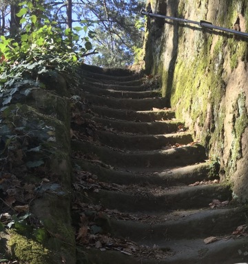 Ale zpět na výchozí bod výletu – parkoviště pod hradem Kokořín. Po červené turistické značce se dostáváme přes malebnou osadu Hlučov k Pokličkám - symbolu celého Kokořínska (cca 2 km). Jdeme po části takzvané Máchovy cesty, která vede od Mělníka až po Máchovo jezero. Nahoru na vyhlídku na Pokličky je cesta po desítkách schodů - některým pejskům, zejména těm starším, to nemusí být úplně příjemné, pokud trpí na klouby, ale já to vyběhnu jak nic.