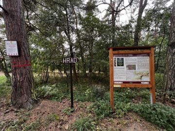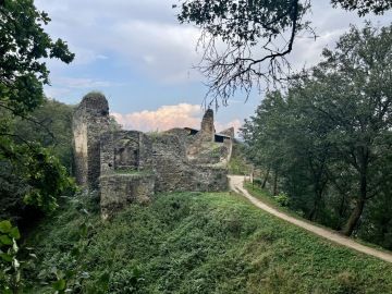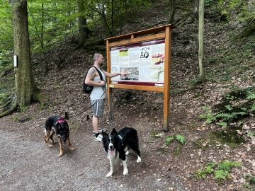Parkoviště je od hradu cca 1,8 km. Už od začátku nás čekala pohodová cesta mezi loukami a po chvíli se objevil vstup do lesa. Byla tam spousta cedulí, kudy se jde na hrad a taky připomínka, že pejskům je zakázán volný pohyb. Nedivíme se, přeci tu nechceme rušit turisty (i když jsme žádné nepotkali), ale hlavně nechceme rušit místní zvířátka, těch tu bude určitě hodně. Páníčci nám dali vodičku, dali nám fešácká vodítka a mohlo se jít. Škoda, že s námi nebyl malý dvounožec, protože pro kočárky a malé prcky je tato cesta jako dělaná. My jsme si užívali každý čmuch po cestě a páníčci to neuvěřitelné ticho a klid.