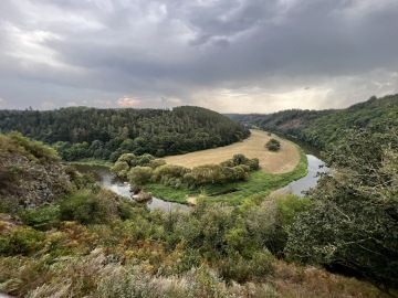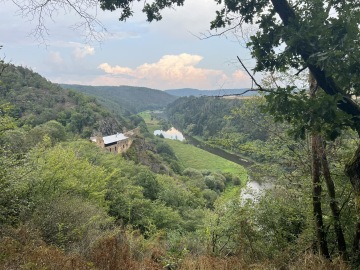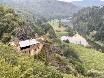 Cesta byla tak příjemná, že jsme co nevidět byli skoro u hradu Krašov. Jako první, jsme ale zamířili na vyhlídku. Nebudeme vám lhát, je to naprostá nádhera, panička je romantická duše, takže jsme se usadili na lavičku a chvíli se kochali tím úžasným výhledem na hrad a řeku Berounku. Pomalu se začalo stmívat, proto jsme pak rychle vyrazili ještě ke zřícenině hradu. Hrad leží na skále, bohužel bylo zavřeno, a tak jsme se ještě jednou pokochali výhledem na lesy a na řeku, která spíš připomínala hada nebo podkovu.