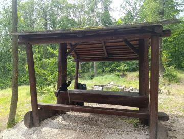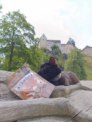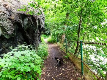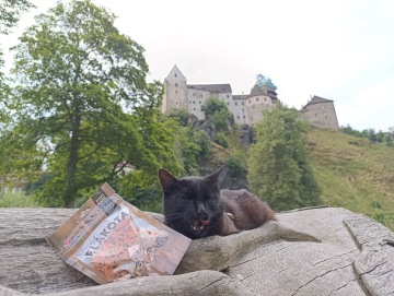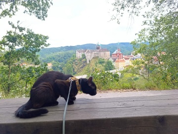 Pokračovali jsme po schodišti, kde se na vrchu ukazovaly stěny hradu Loket. Na nádvoří byla spousta lidí, ani jsme tam tedy nešli, jelikož my na ty návštěvy hradů moc nejsme a domácí mazlíčci mají vstup zakázán. Zasedli jsme raději v nedaleké restauraci "Staroslovanská kuchyně" a nabrali jsme síly na další etapu výletu. Potom už jsme si to šlapali rovnou z kopce dolů, až jsme se dostali na hlavní loketský most. Ten jsme celý přešli a za ním se dali doleva, po chodníčku podél silnice, až jsme došli k nepřehlédnutelné dřevěné bráně, pod kterou začíná stezka Třešňovka. Ta nás dovedla prudkým kopcem k první vyhlídce na celý Loket. U té je i ohniště a velký přístřešek, kde jsem si chtěl dát svačinu, tak mi panička vytáhla rybičkové flákota pamlsky. Pochutnal jsem si, ale měli jsme toho pro dnešní den dost. Nějakých 5 km, místy do kopce a do schodů nám stačilo. Vydali jsme se tedy zpět k autu. Vy ale nemusíte, na stezce Třešňovka je mnoho dalších vyhlídek a přírodních atrakcí, které stojí za prohlédnutí.