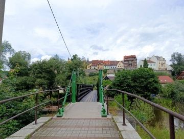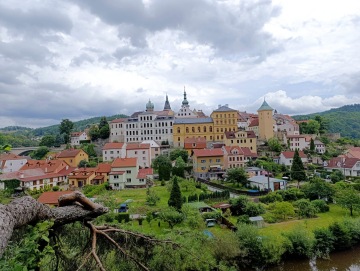 K amfiteátru, kde je moc pěkně položený strom s vyřezanou lavičkou a na ní vždy vzniknou hezké fotky s hradem v pozadí. Když jsem paničce dostatečně zapózoval, vyrazili jsme kolem řeky. Rovně po cestě jsme došli k přístavišti. Naproti je lanový park, kde je možné strávit také další čas. My jsme ale pokračovali dál pod most, lesní cestičkou okolo Ohře až ke skalám, kde na nás čekal skalní tunel a vyhlídkové místo Kolowratská skála. Po necelých 200 m cesty jsme došli k vodnímu jezu s názvem Horní jez, kde jsem se teda bál, protože ta voda hučela jako o závod. Prohlédli jsme si jez a pokračovali až k dřevěné lávce, no a tam jsem se už musel schovat do batohu, jelikož ten most, ten se houpal jako blázen. Za mostem jsme odbočili doleva, já se nesl a dobře jsem udělal, panička totiž za pár metrů zabočila doprava na úzké schody nahoru, prý abychom vyšli hned pod náměstím.