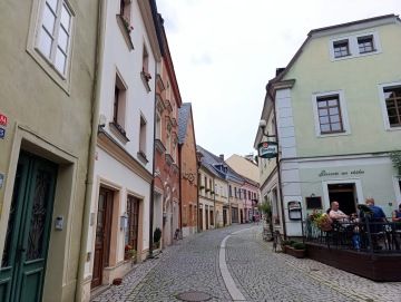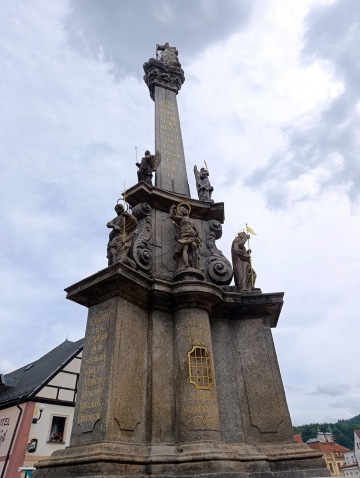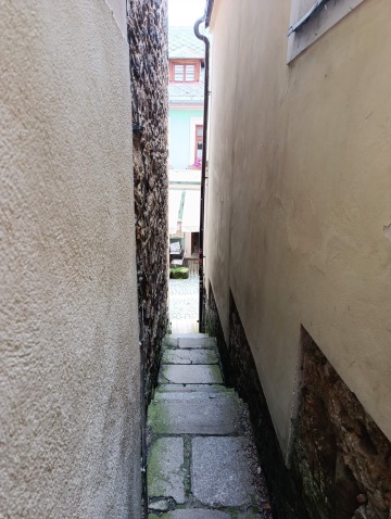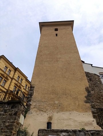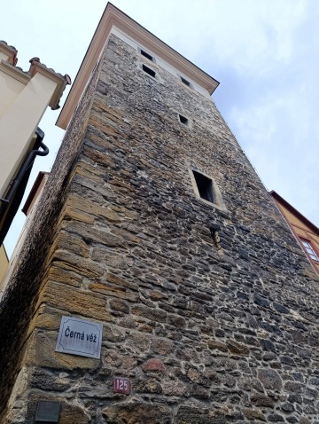 A tak se stalo, vyfuněla schody a v dáli už se hemžily davy turistů. Vzali jsme to přímo skrz náměstí, okolo sloupu Nejsvětější Trojice až k Černé věži. U té jsme tajnou uličkou zahnuli doleva na schody. Vyškrábali jsme se ke dveřím věže, kam je vstup 20 Kč na osobu, ale panička neměla drobný, a tak jsme si věž jen prohlédli z venku.