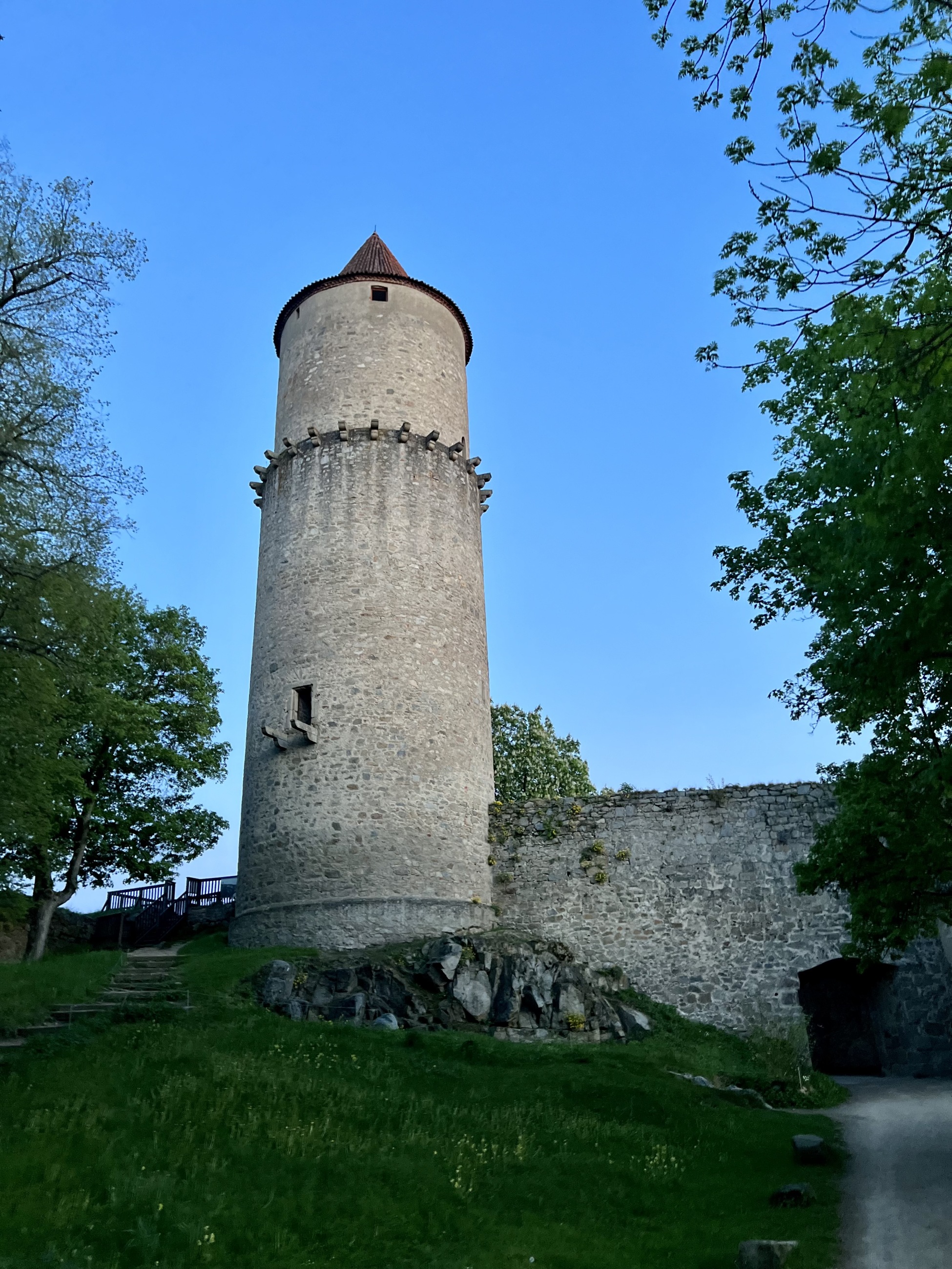 Parkoviště se nachází cca 1 km od hradu. Jde se po asfaltové cestě až k hradnímu přemostění. Nemusíte spěchat hradby se zavírají až ve 21:00 hodin a i my jsme na hrad přijeli ve 20:00 hodin. Nádvoří má až zvláštní energii a je možnost se rozhlédnout do širokého okolí na obě strany. V první části Hlízové věže neboli Markomanky, můžete pozorovat spoustu různých značek vtesaných do kamene. O věži se nevypráví rozhodně nic hezkého, ale to si povíme za chvíli. Teď pojďme pročmuchat zbytek podhradí.