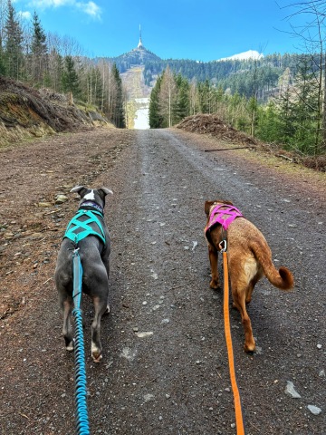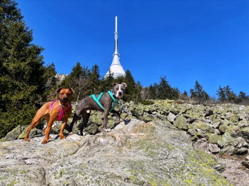 Z parkoviště jsme nastoupili na Beranovu cestu, kde se za příznivého počasí otevírá pohled na Ještěd. Po chvíli jsme došli ke stanici lanovky Horní Hanychov, od ní jsme sešli na silnici, po které jsme ťapkali cca 450 m a pak už se napojili na modrou turistickou trasu. Ta záhy prověřila fyzičku našich páníčků, protože nás čekali 3 km do kopce. No my jsme byli v pohodě, ale panička si za námi brblala něco o tom, zda má tohle zapotřebí. “Tak to teda máš a koukej šlapat!”😁