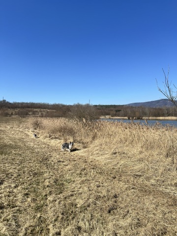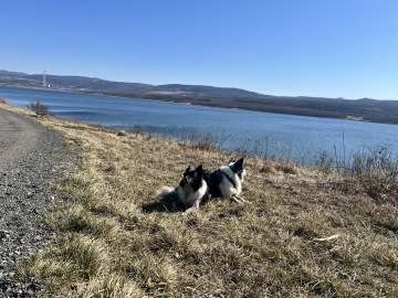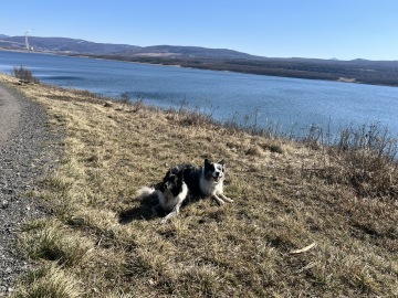 Po zadání cíle cesty do navigace (stačilo zadat Jezero Milada), nás paní, co nám říkala cestu zavedla přímo na parkoviště u jezera. Bylo tam jen pár aut a parkování bylo zadarmo. Vydali jsme se vlevo a užívali si klidu a ticha. Bylo vidět daleko, a tak jsme mohli být chvílemi i na volno, jinak jsme ťapali poslušně na vodítku. Nám to ale nevadí, protože i tak se dá zažít spousta zábavy a čmuchání.