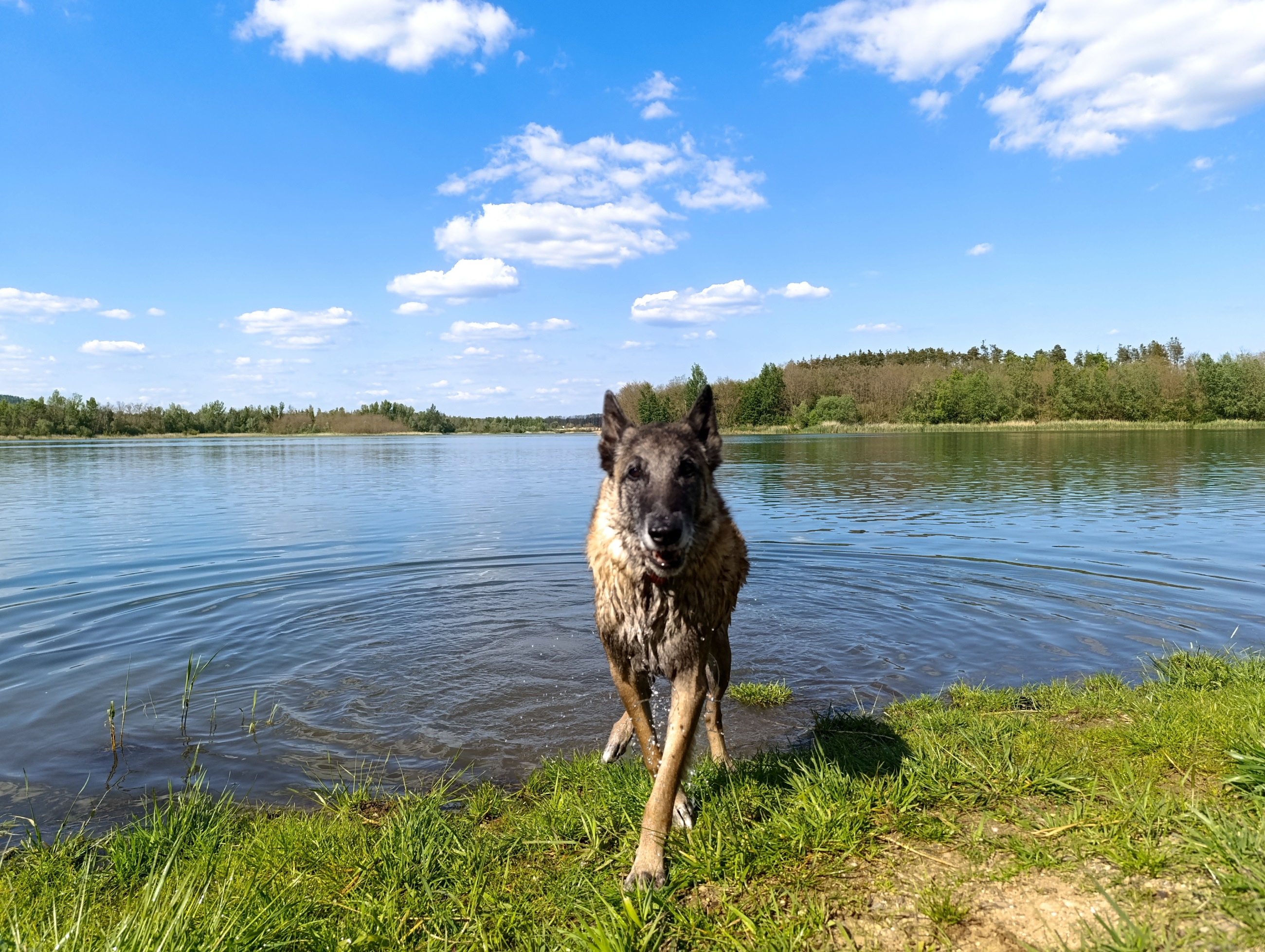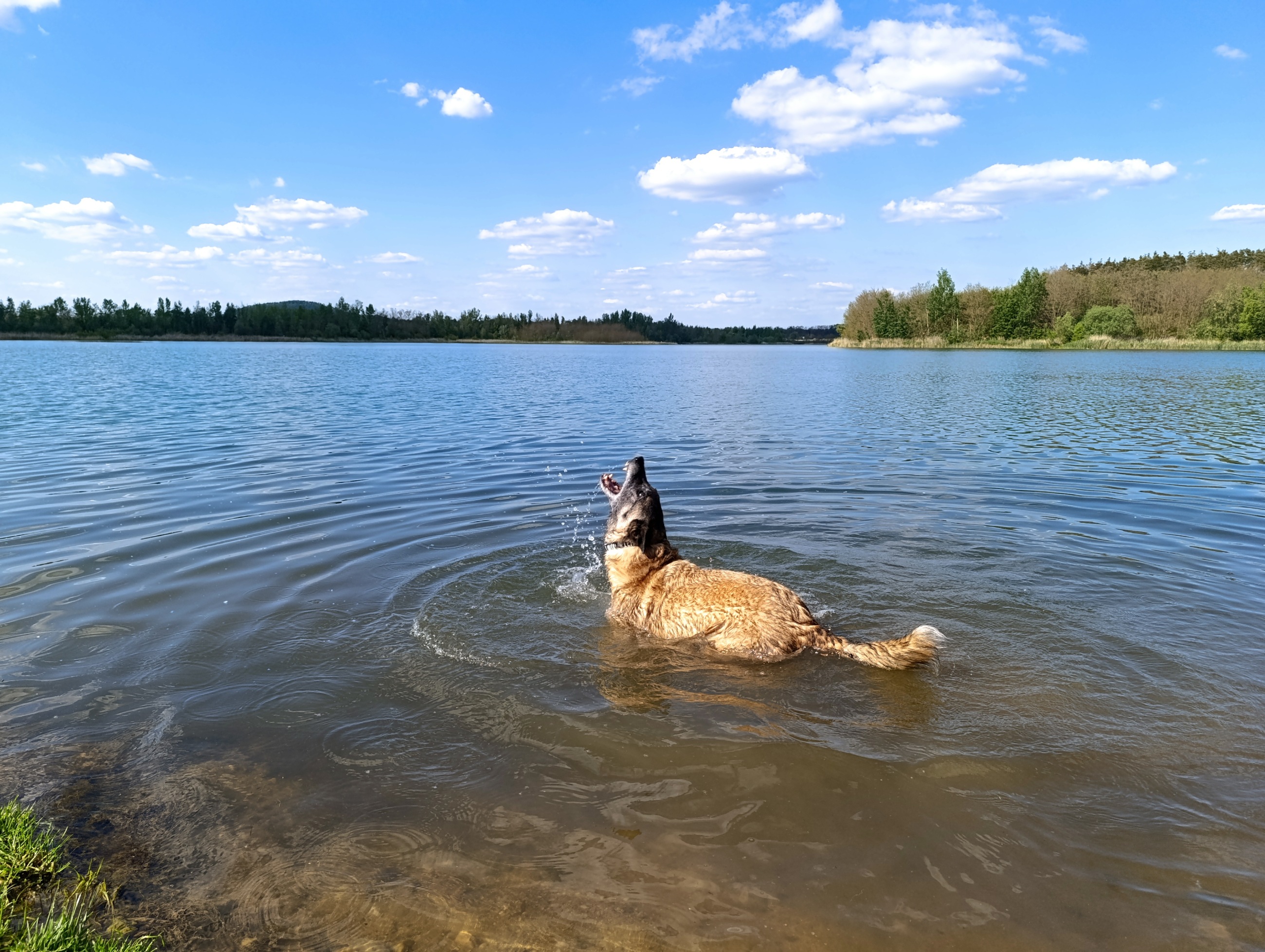 Kupodivu tam nikdo nebyl, a tak jsme to měli jen pro sebe. Přístup k vodě je ze všech stran a všude je krásně čistý písek. Pískovna je opravdu rozlehlá, je tedy skvělou variantou přeplout si jí třeba na paddlebordu. Každopádně my se jen vykoupali a relaxovali ve stínu, Lokiho jsme taky přizvali do vody a zaplaval si s námi. Nabrali jsme tak síly na cestu, která byla před námi.