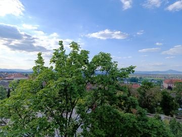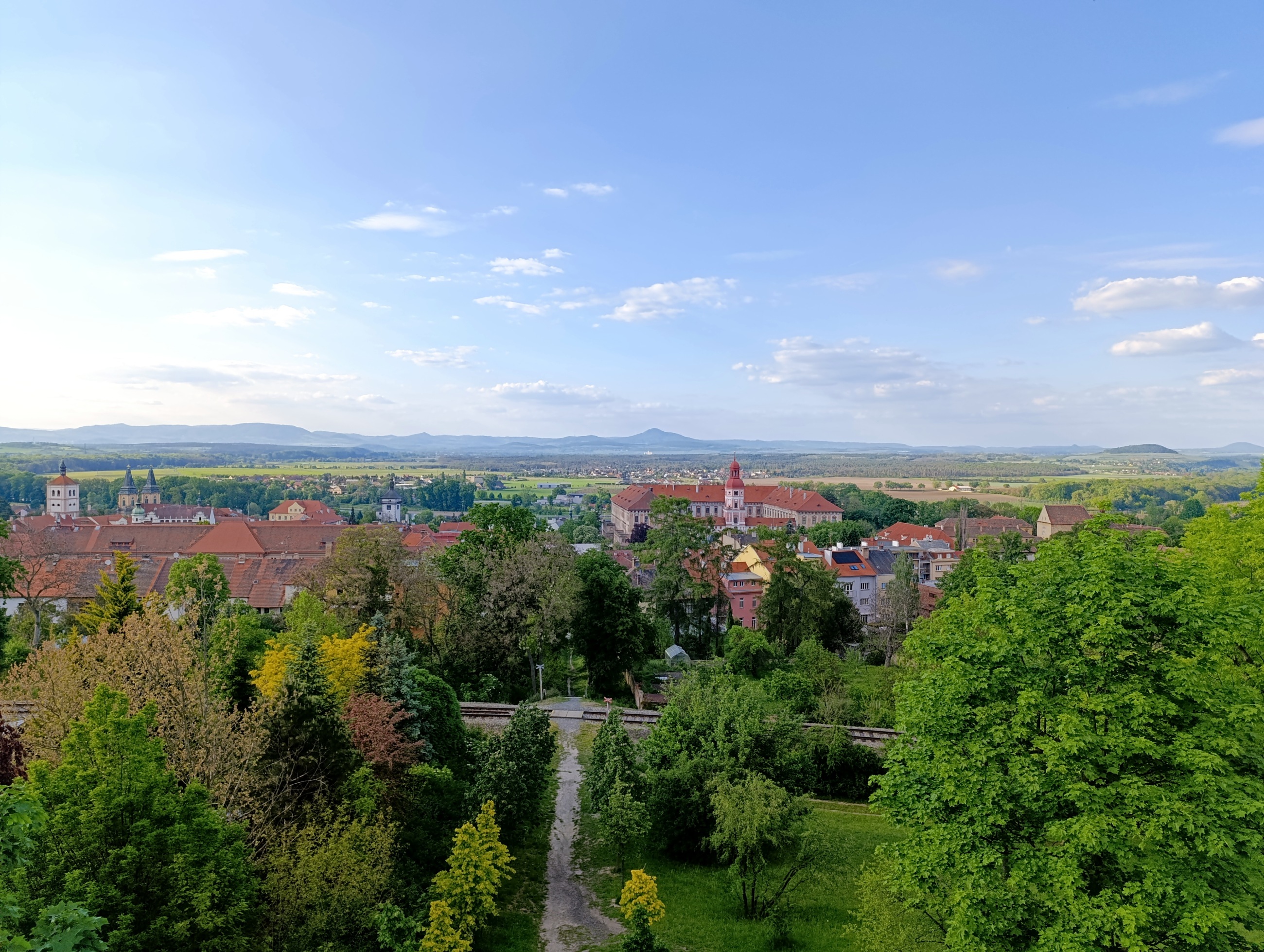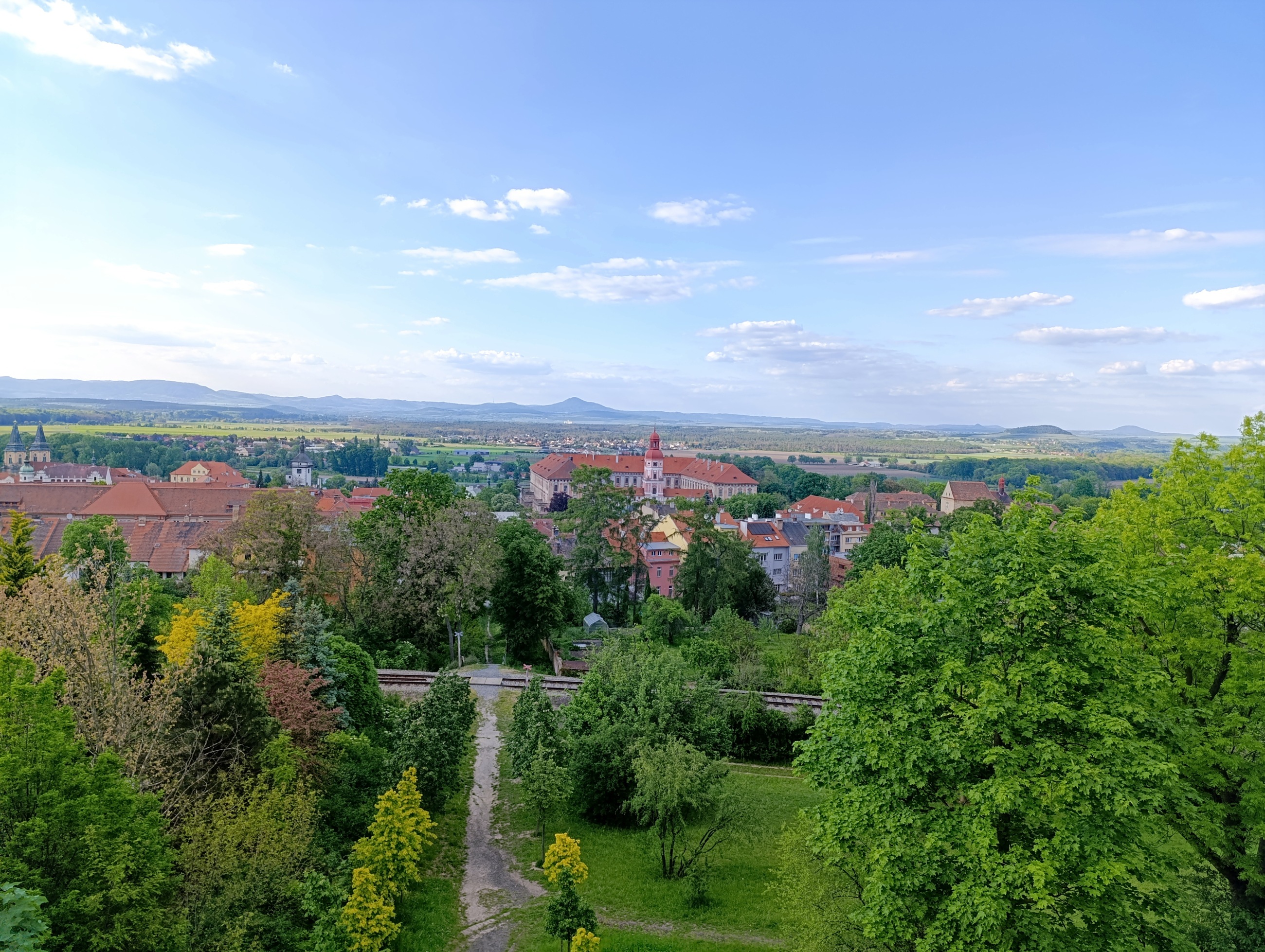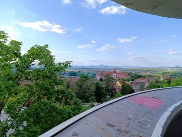 Výhled stál za to, a i přes menší rozhlednu přímo nad městem nabízí pěkný výhled do dálky. Zatímco jsme vše dokumentovali proběhlo pod námi pár běžců, ale jinak se moc lidí kolem rozhledny nepohybovalo. Zapózovali jsme, pokochali se a zbývalo nám už jen se vrátit zpět k autu. Zvolili jsme stejnou cestu, a tak jsme šli po paměti zpět k řece a po cyklostezce zpět k našemu kočáru.