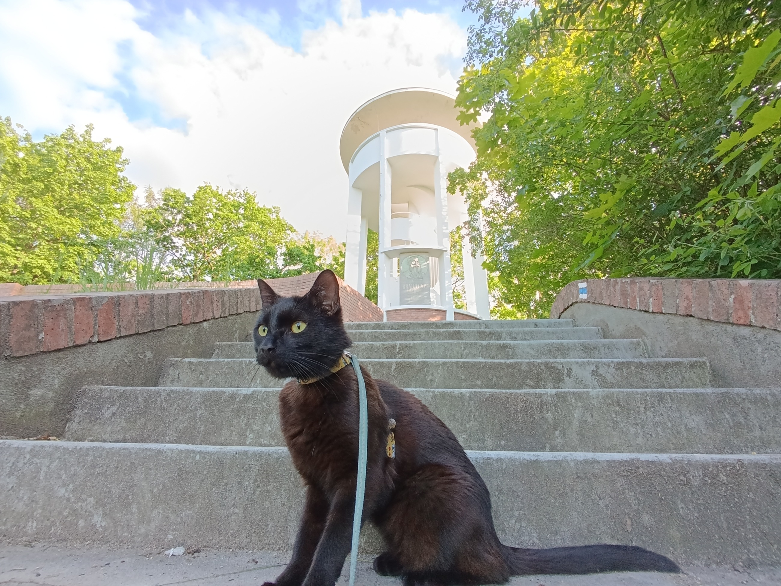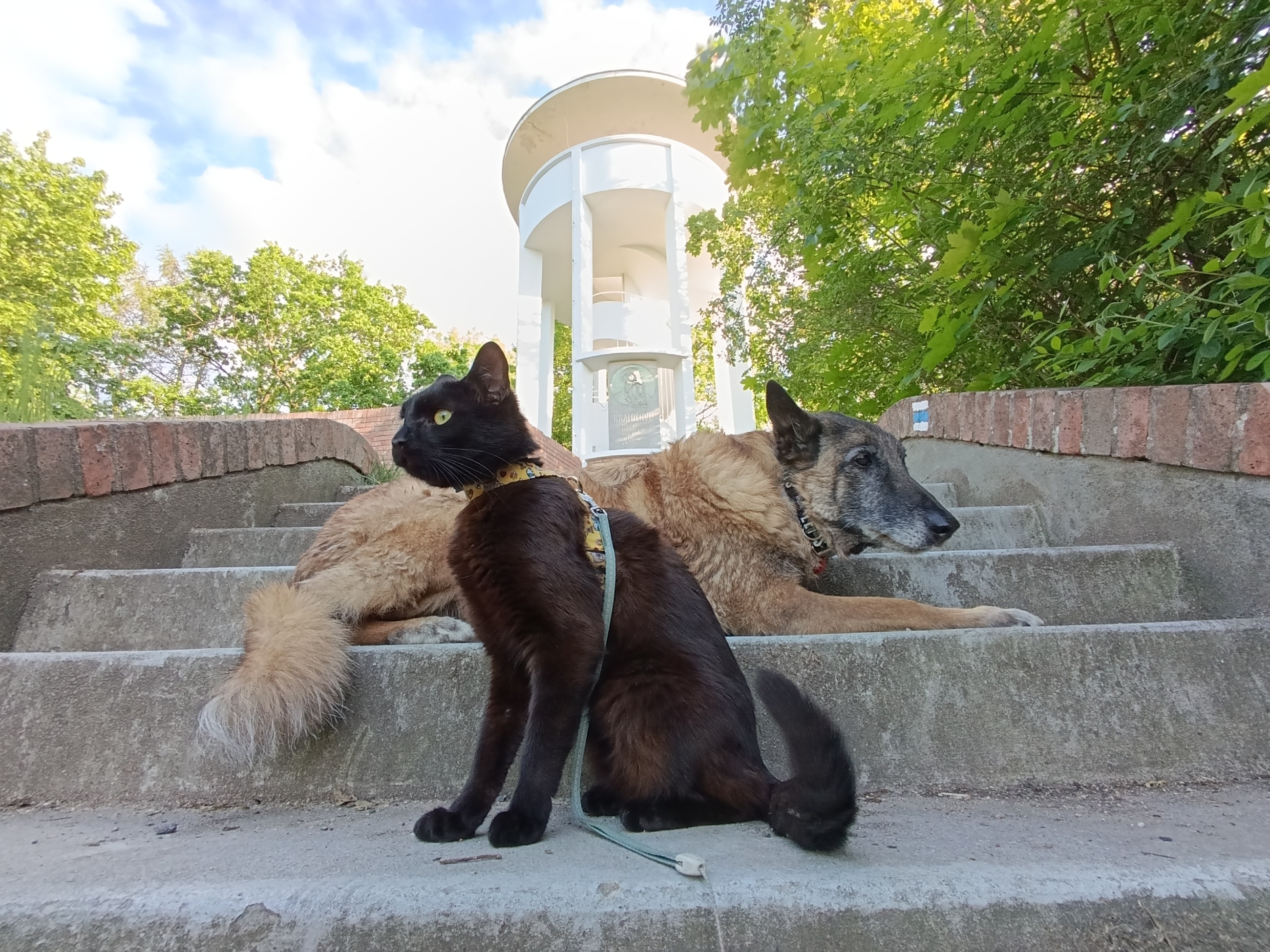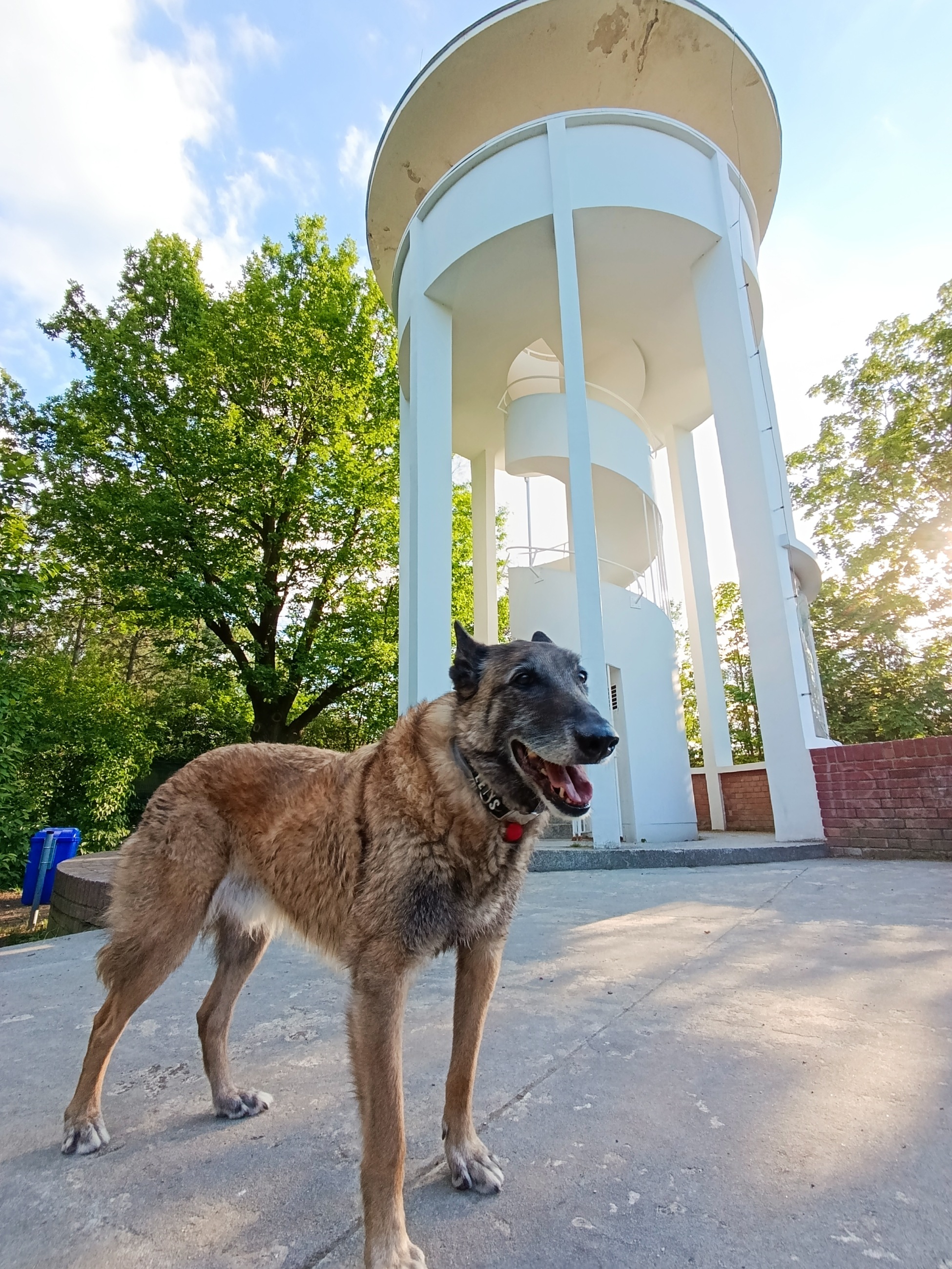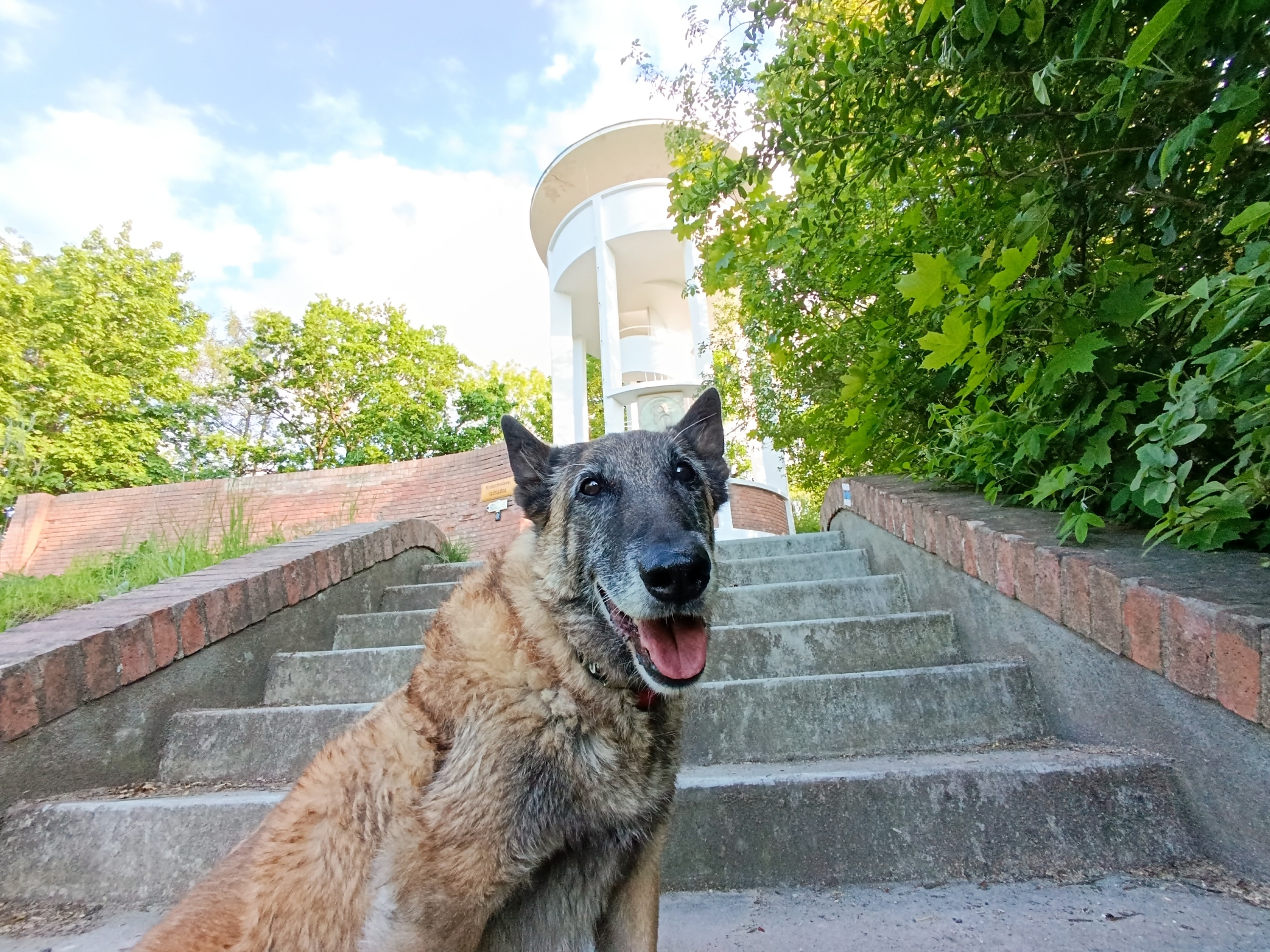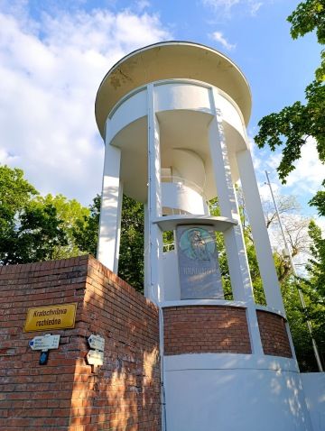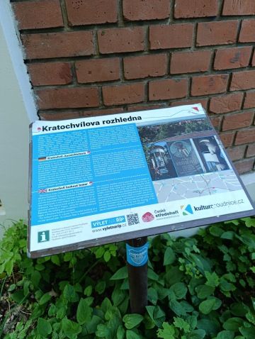 Tahle etapa byla trochu náročnější, je to totiž do kopce kolem vlakového nádraží. Kopec nám dal zabrat, ale vyšlapali jsme ho až k Lobkowiczkému zámečku, kde nás nechtěli. Se psy je tam vstup zakázán, a to i do zahrad. Pokračovali jsme tedy k našemu hlavnímu cíli. Zbývala nám už jen cesta přes hlavní křižovatku bokem náměstí, kde je také spousta možností na jídlo a kávu. Panička nám od náměstí hlásila ,,už jen pár metrů". A měla pravdu, za pár minut jsme viděli ukazatel "k rozhledně". Bylo to necelých 100 m, kdy jsme zahnuli doleva na lesní cestičku, přes koleje a už nás v dáli vítala Kratochvílova rozhledna. Já celou cestu odťapal, ale Loki se nesl a vyskočil až pod rozhlednou, aby mohl zafrajeřit na video a samotnou rozhlednu si vylézt sám. A tentokrát jsem na rozhlednu mohl i já, není totiž nijak vysoká a má hezké betonové schody.