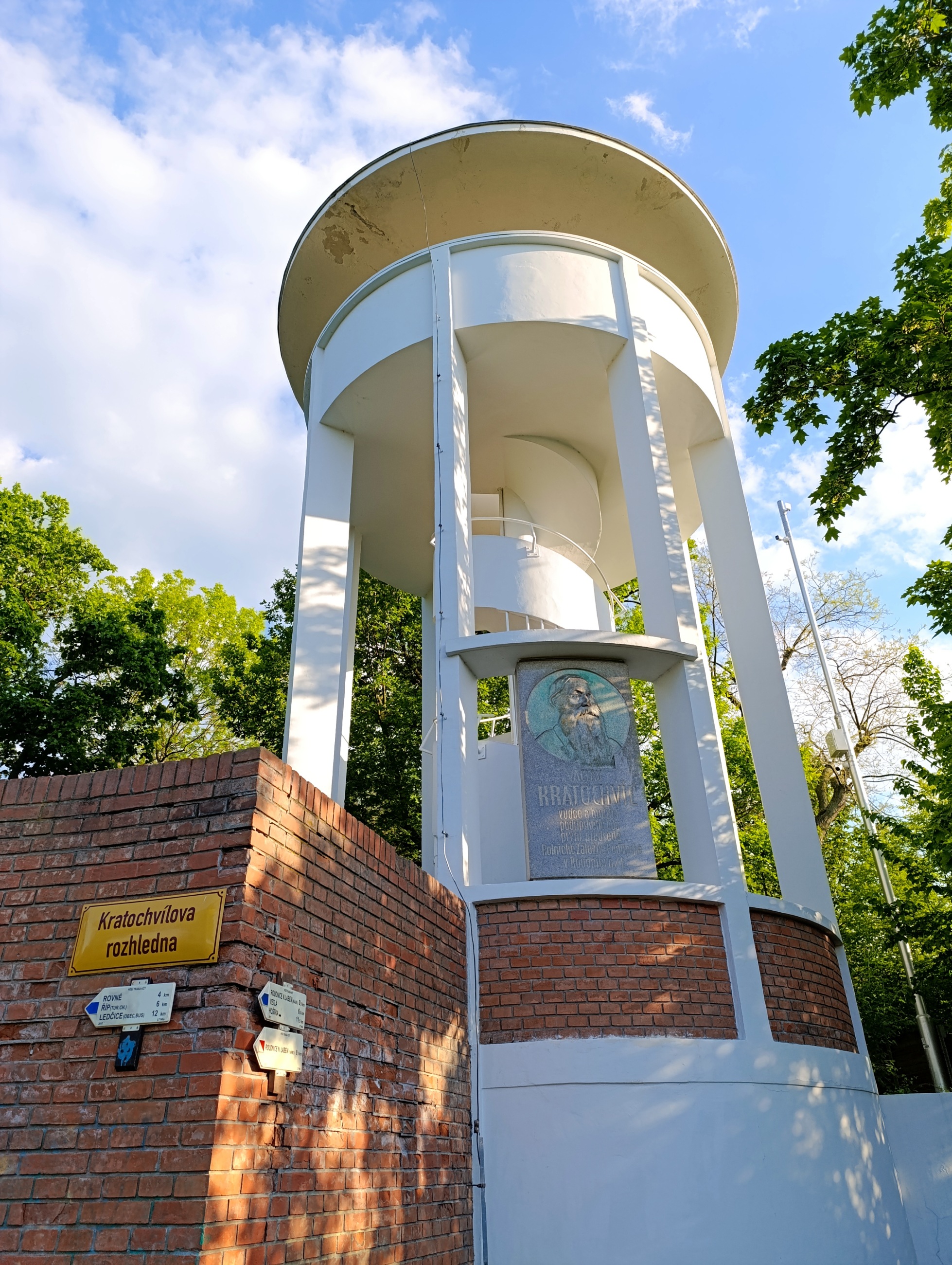 Rozhledna byla postavena roku 1934 u příležitosti 60. výročí založení „Roudnické záložny podřipské“. Jedná se o čistě funkcionalistickou stavbu, jejíž výhledová plocha je nesena šesti štíhlými sloupy. Podél středového sloupu se stáčí vřetenové schodiště. Na obvodu horní hrany plného zábradlí výhledové plochy byly připevněny měděné desky se schematicky vyrytým panoramatem okolní krajiny. Kratochvílova rozhledna je společně s rozhlednou na litoměřické Mostné hoře nejníže položenou rozhlednou u nás (230 m n. m.). Rozhledna je otevřena denně od 9.00 - 19.00 hod. Po vystoupání 49 schodů na vyhlídkovou plošinu ve výšce 13 metrů nad zemí se naskytne výhled severním směrem na České středohoří.