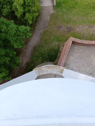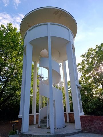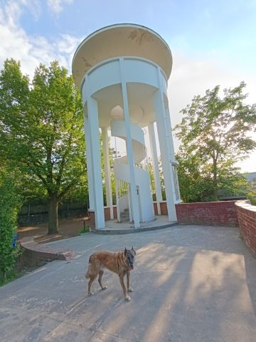 - Rozhledna je betonová, třípatrová a s pejskem se snadno vyleze po schodišti až nahoru.