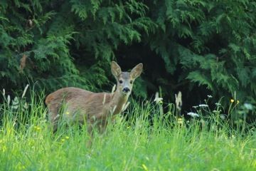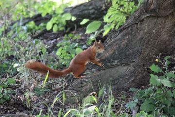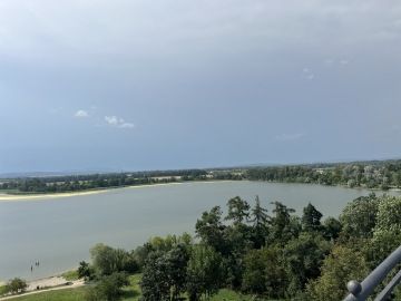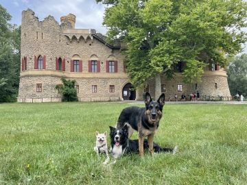 Čmucháním nám vše rychle uteklo, potkali jsme dva srnečky a jedno malé zvědavé hnědé zvířátko. Bylo dost drzé, tak jsme si ho chtěli pořádně prohlídnout, vodítko nám ale nestačilo a panička nám vysvětlila, že je to jen zvědavá veverka. Než jsme vše vstřebali, už jsme byli u Rozhledny minaret. Hned vedle bylo občerstvení, tam jsme se usadili, páníčci si dali párek v rohlíku a moc milá paní nám dala kyblík čerstvé vody a také nám doplnila lahve na cestu. Mezitím co jsme odpočívali, panička si vyšlápla 62 metrovou romantickou rozhlednu. No romantiku si asi každý představuje jinak, pěkně se nám u toho výšlapu v tom horku zapotila, ale ty výhledy prý stály rozhodně za to. Nám mezitím nic nechybělo a hezky jsme si odpočinuli.