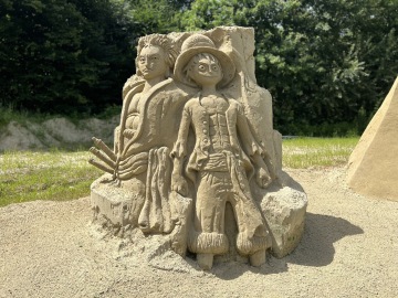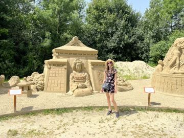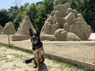 Tady náš výlet měl končit, páníčci ale zjistili, že jako každý rok tu jsou opět sochy z písku jen 100 m od parkoviště. A tak jsme si udělali poslední zastávku. Na výstavě Michala Olšiaka bylo možné vidět 20 nádherných soch, na které padlo téměř 1 875 tun písku. Nejvíc nás všechny překvapilo, že tam byly i sochy tvořené chlapci ve věku 12 a 13 let. A byly nádherné, co si budem panička by takovou krásu nepostavila ani ve svých 30 letech. Pro dospěláky a pejsky je na místě příjemné posezení a pro nejmenší krásné pískoviště.