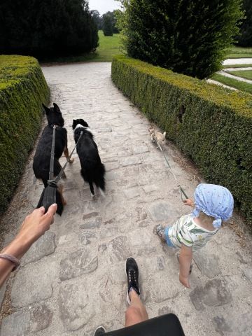 Cesta k minaretu, vede krásnou příjemnou stezkou k přístavišti, odkud je možné se plavit lodí, my ale radši chodíme a čmucháme. Za přístavištěm nás čekalo první vyhlídkové místo na celý Lednický zámek, páničci se tam museli chvíli pokochat, než jsme pokračovali dál. Nádherná stezka nás rozmanitými cestičkami vedla přes lávky, kde byl krásný výhled na zámecké rybníky. V půlce cesty na nás čekala pekelná jeskyně a akvadukt, ani to jsme si nemohli nechat ujít a vše jsme pořádně prozkoumali. Dávali jsme si na čas, náš malý dvounožec má ještě malé nožičky a je moc zvědavý, tak mu vše dlouho trvá.