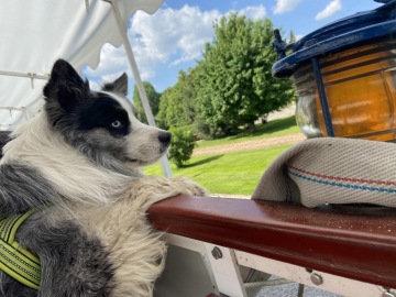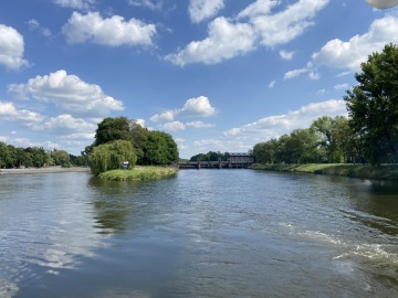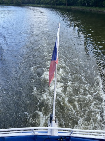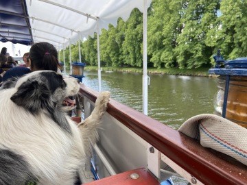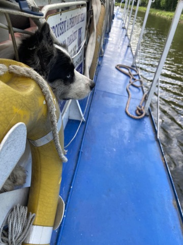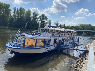 K mému překvapení jsme čekali na loď! Nastoupili jsme, zaplatili vstup 130 Kč za dospělého (já jel zadarmo) a šli nahoru obdivovat výhled na soutok Labe s Cidlinou a okolí. Loď se otočila a pomalu jsme pluli zpět podél cesty, po které jsme přišli. Cestu jsem si opravdu užil. Byla tu zase spousta dětí, které si se mnou hrály a ochotná slečna, která obsluhovala dvounožce, mi donesla plnou misku s vodou. Dopluli jsme do komor, kde jsme se trošku zdrželi, protože jsme čekali, až se hladiny dorovnají a už jsme pluli dál co cíle.