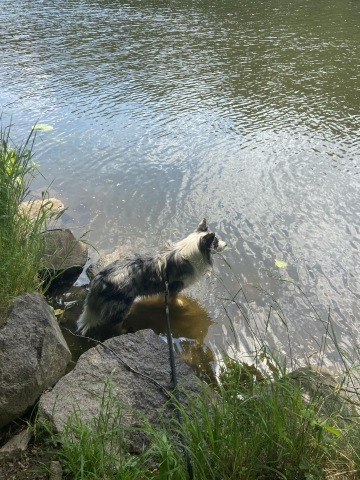 Jsme v Poděbradech. Přejdeme silnici a jdeme kolonádou, kde potkáváme spoustu lidí, psů i dalších dětí. Na pár místech si mě chce vyfotit, už zase... pomalu se blížíme na náměstí. Tam přejdeme hlavní silnici, dáme se doprava a po pár metrech doleva k mostu. Těsně před ním se dáme dolů k vodě, kde proudí řeka Labe. Dali jsme se doleva k přístavišti a pokračovali pořád rovně přímo do dalšího přístaviště Cidlina. Po cestě se to hemžilo cyklisty, ale naštěstí hned vedle asfaltové cesty byla cestička po trávě, ještě blíže u vody. Tuto cestu od asfaltové oddělovaly stromy, a tak jsme měli soukromí a mnohem lépe se nám ťapkalo. V místě, kde bylo málo vody, jsem se i osvěžil. Pro páníčky bylo cestou pár stánků a tam si panička dala limču. Zanedlouho jsme už byli v cíli v přístavišti Cidlina, kde byla i restaurace U Přívozu. Tady měli spoustu jídla i pití, ale panička stihla zase jen limču a už jsme si šli stoupnout do fronty. To se mi moc nelíbilo, ale ostatní si dávali velký pozor, aby mi omylem nešlápli na pacičky.