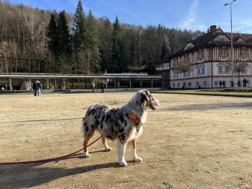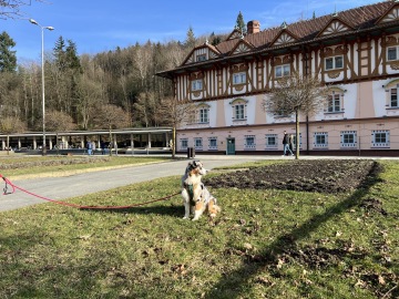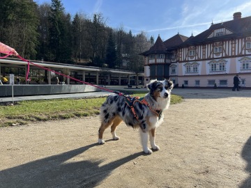 Vyskákali jsme všichni z auta, přešli přes Luhačovický potok a vydali se po červené turistické značce směr kolonáda. Prvním cílem totiž musely být oplatky. Na ty se děti hrozně těšily a celou cestu o nich mluvily. Byla jsem hezky na vodítku, šla vzorně u nohy paničky a po cestě potkávala spoustu kamarádů.