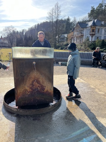 Na Lázeňském náměstí jsme se zastavili a děti se vydaly ochutnat onen pramen Vincentka. Moc se teda netvářily, a tak jsme přešli přes náměstí k dalšímu prameni zvaný Nový Jubilejní. A nemohli jsme ani vynechat pramen Ottovka, ke kterému jsme se vydali po žluté turistické značce. K dalšímu prameni Aloiska už děti odmítly jít, a tak jsme se vrátili zpět po červené turistické stezce na kolonádu na slíbené lázeňské oplatky.