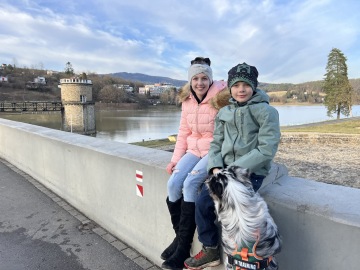 Potom nás už čekal okruh okolo celé vodní nádrže (cca 3 km). Ale protože to vypadalo, že zmokneme, zvolili jsme raději cestu zpět k autu Jurkovičovou alejí po červené stezce. Šli jsme velmi příjemnou širokou cestou, kde jsem se mohla proběhnout, ale museli jsme dávat pozor. Občas tu projeli i nějací cyklisti. Poslední úsek výletu jsme klesali podél Luhačovického potoku zpět k parkovišti.