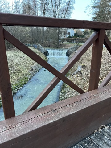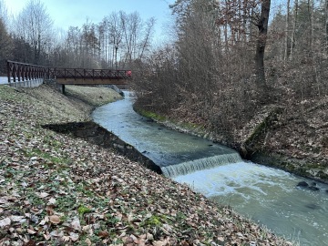 Přešli jsme lávku a vydali se po modré stezce kolem secesního Lázeňského domu Jestřabí, dál mírným kopečkem až k infoaltánu Křapodola. Odtud jsme sešli nevyznačenou úzkou lesní cestou, kterou jsme se dostali až k vodní nádrži.