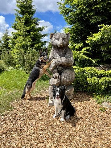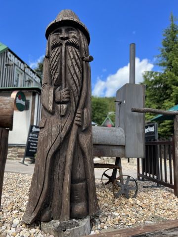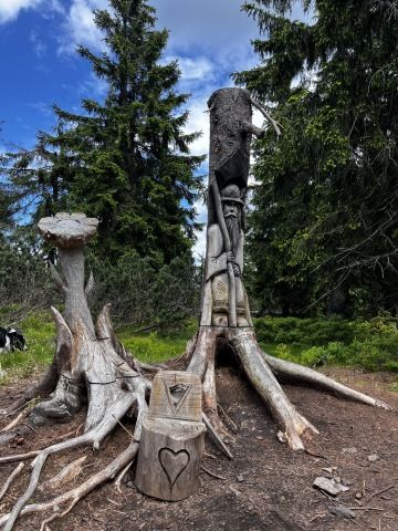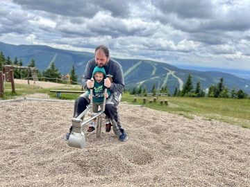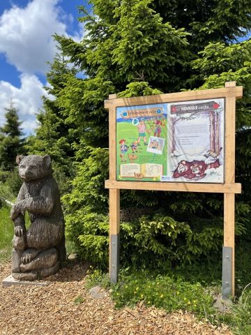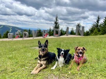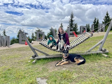 Na vrcholu nás čekal lyžařský areál, kde se páníčci mohou občerstvit a koupit si kafíčko, ale ať si připraví hodně papírků, ceny jsou celkem vysoké. Kromě občerstvení je tam nádherné dětské hřiště. Ale to úplně nejhezčí je obrovský dřevěný název Medvědín. V některých písmenkách se dá dokonce krásně relaxovat. Z medvědína je nádherný výhled do okolí.