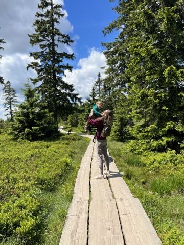 Stezka vede krásnou úzkou uličkou, kde už i náš malý dvounožec ťapal po svých a moc se mu to líbilo. My jsme se také konečně mohli pořádně proběhnout. Touto uličkou jsme došli na Svinské louže (1212 m), kde je nádherný dřevěný chodníček uprostřed ještě krásnější přírody, no až paničce spadla brada.