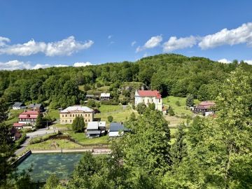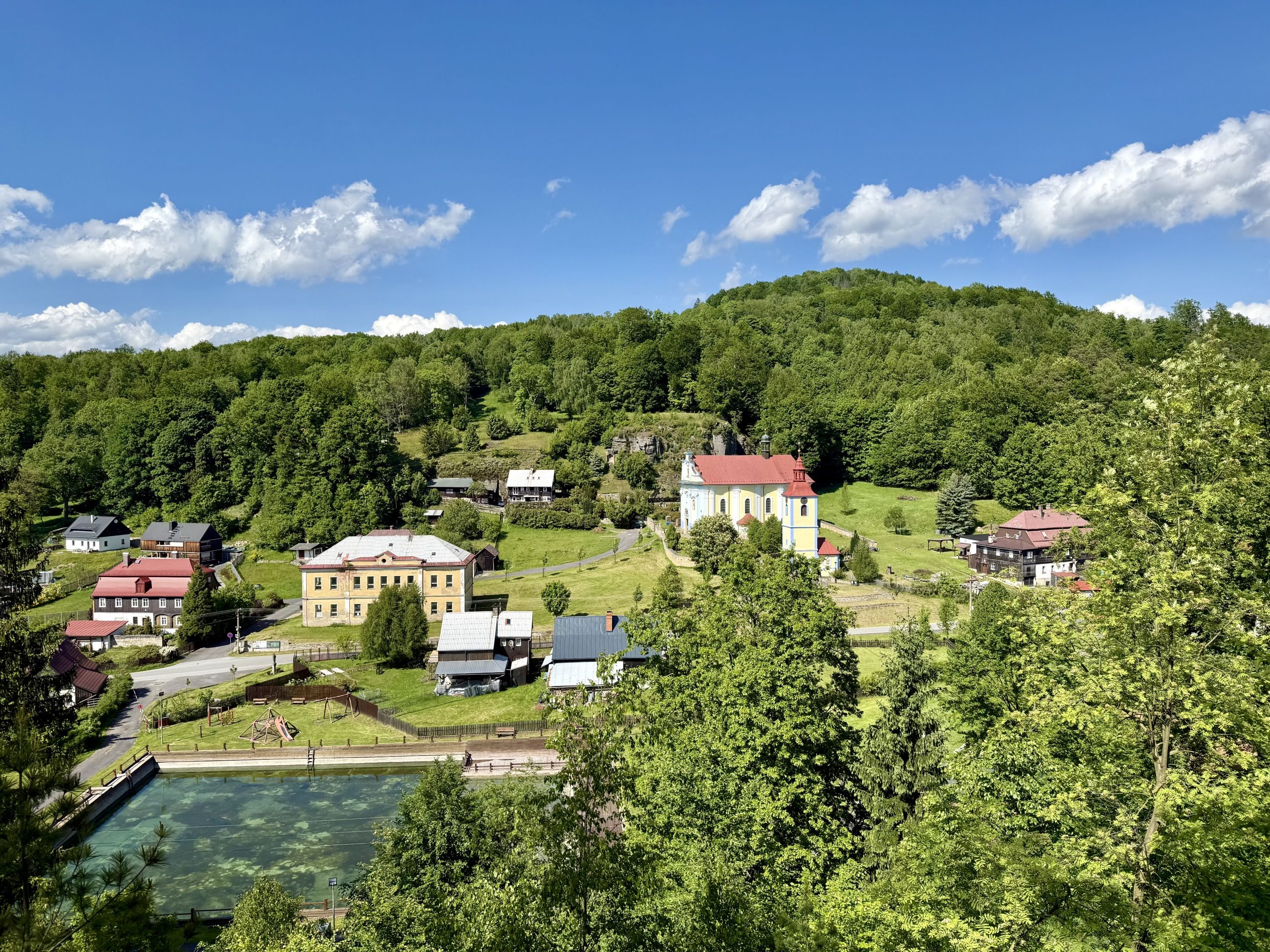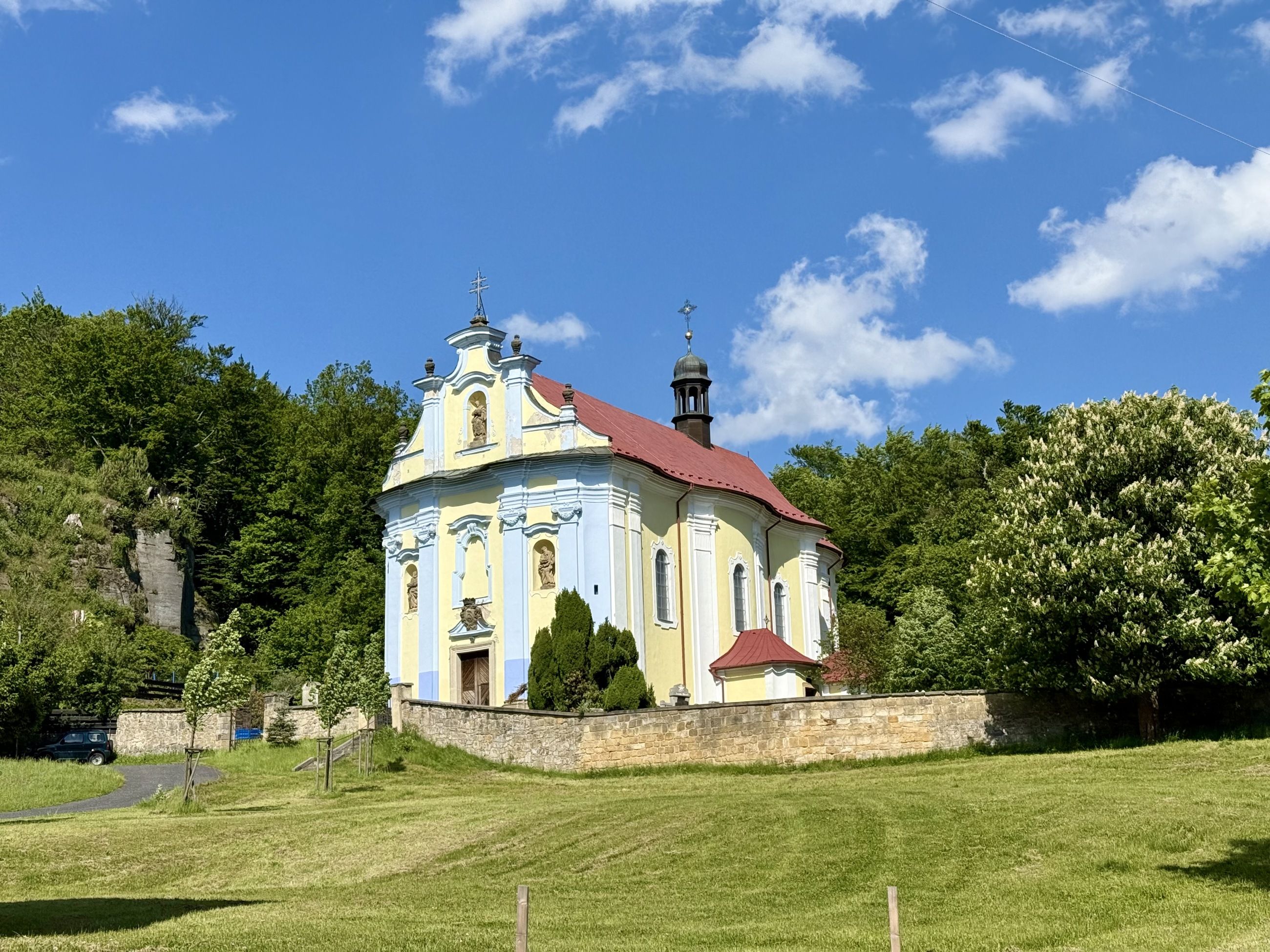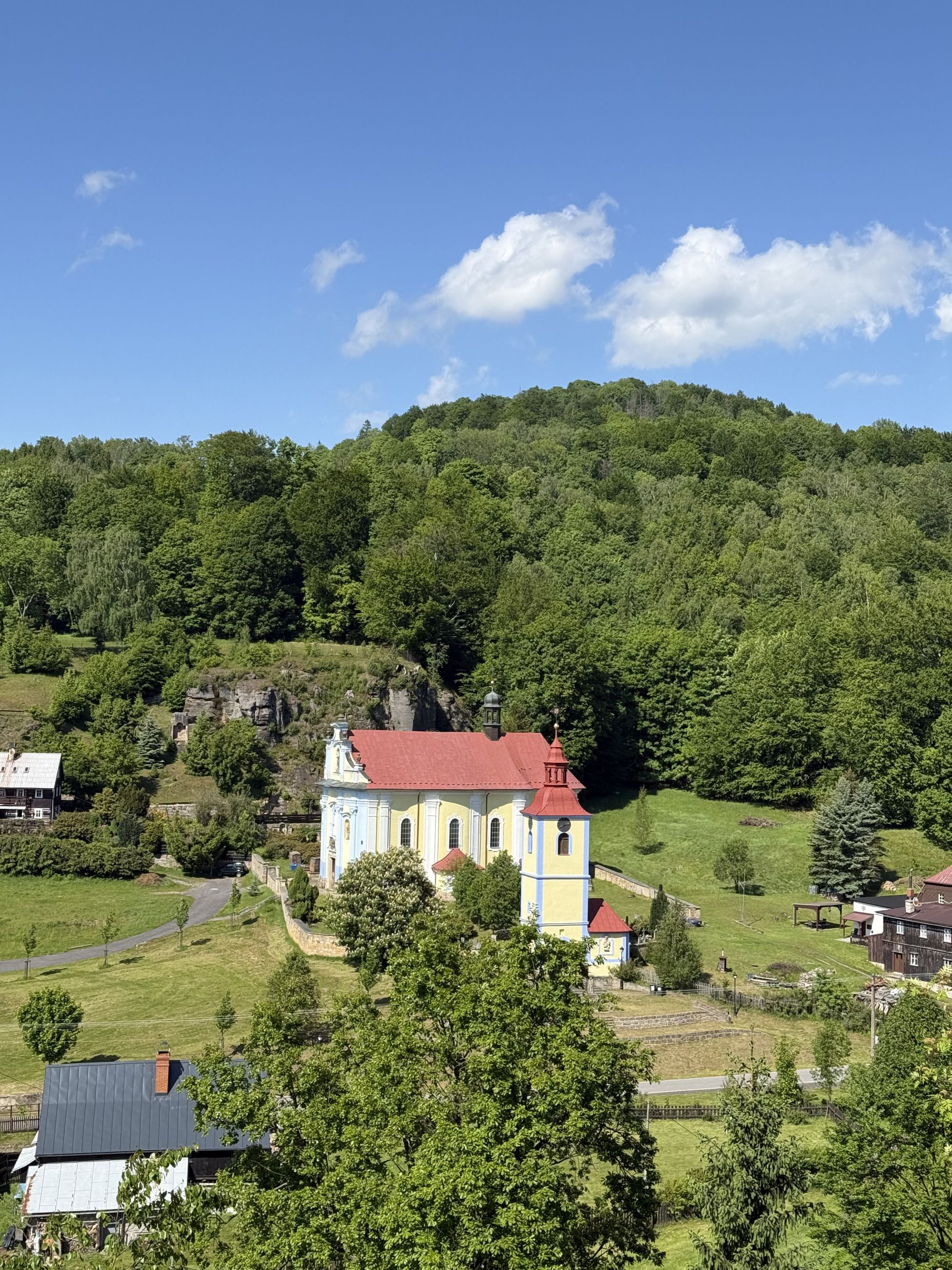 Po cestě zpět jsme to vzali kousek po silnici. Čas už nám totiž šlapal na packy a silnice nebyla tolik frekventovaná. Navíc vedla okolo moc krásného kostela, který byl vidět z vyhlídky. Touto cestou jsme se napojili v Horním Prysku opět na žlutou stezku a došli jsme zpět k Panské skále na parkoviště, kde jsme parkovali.