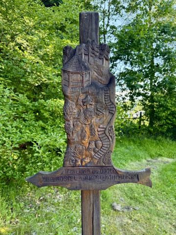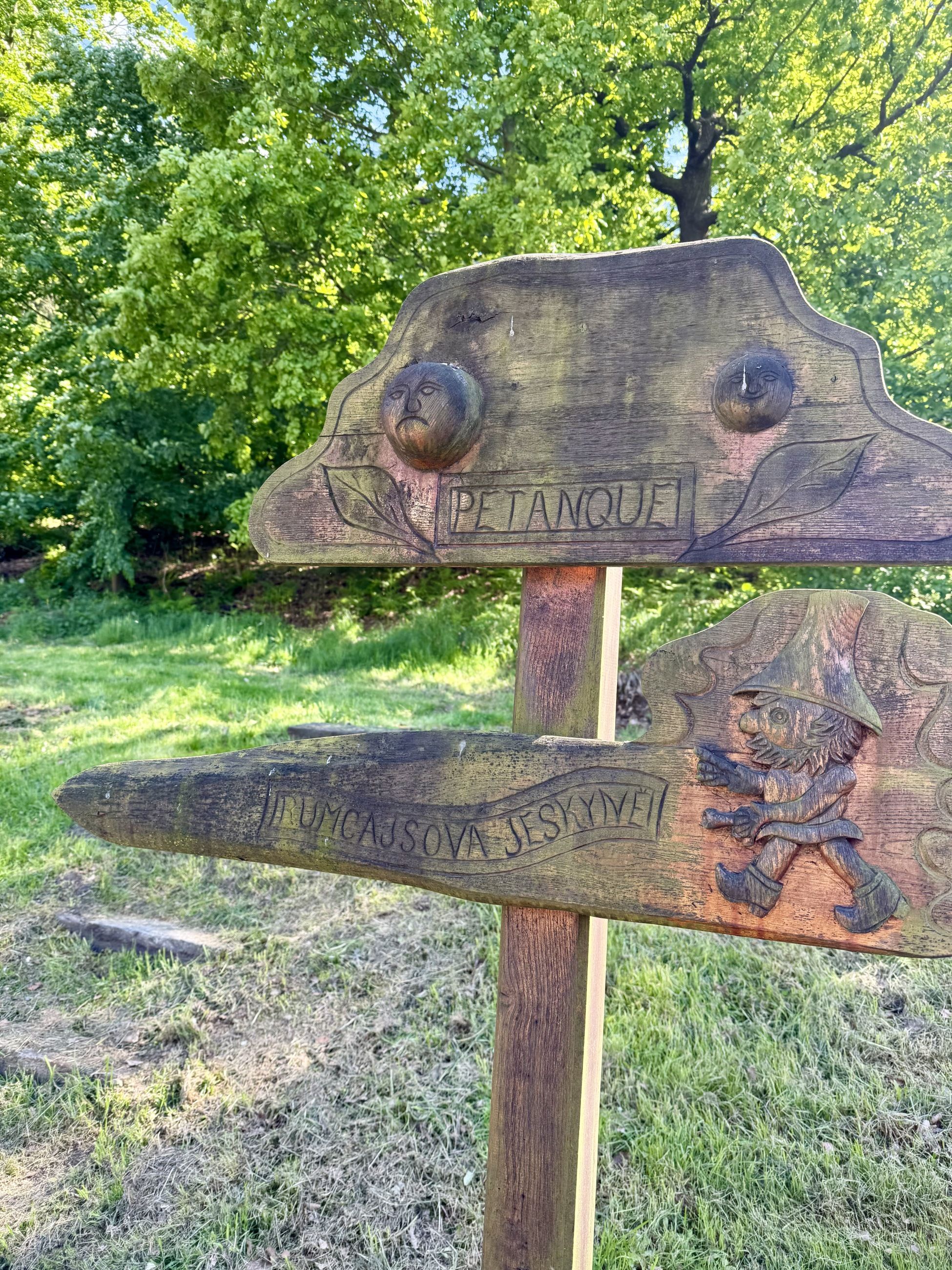 Po nějaké chvíli jsme došli až do Horního Prysku, odtud jsme vyrazili po zelené. Vyšlápli jsme si pěkně strmé schody, za kterými se ale opět schovával nádherný výhled a ještě krásnější příroda. Tam jsme dorazili jen na vyhlídku, pročmuchali jsme okolí a vrátili se zpět na stezku. Po chvilce jsme narazili na první dřevěné cedule se směrem jeskyně. Podle páníčků tak krásné cedule museli dát spoustu práce.