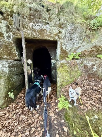 A rovnou za čumákem od cedulí byla jeskyně už opravdu kousek. V jeskyni se nachází rytina Rumcajse a jeho rodiny. Pokud byly pohádky o Rumcajsovi celé dětství jako pro naše páníky, určitě to oceníte.