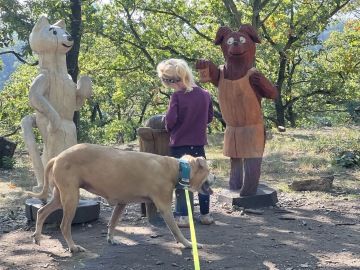 Celou cestou nás doprovázely pohádkové postavičky, které se snaží spolek postupně doplňovat o nové. Navíc jsme chodili pořád ve stínu stromů, což bylo ideální pro všechny. Kromě dalších výletníků jsme potkávali i jejich psí mazlíčky, kteří byli stejně jako my hezky na vodítku.