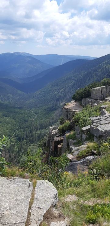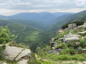 Museli jsme ošetřit rozbité koleno nejmenšího z našich dětí, a tak máme další pauzu u potůčku. Pravda, cesta je trošku kamenitá, ale i přesto míjíme kočárky s dětmi. O kousek dál se panička kochá výhledem z Ambrožovy vyhlídky a fotí.
