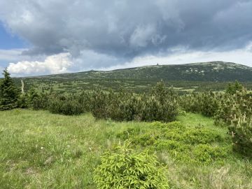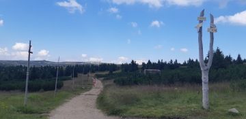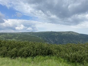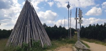 Páníčci se chtějí podívat na chvilinku i za hranice naší vlasti 😊, a tak vyjdeme k České budce. No, za mě to tu vypadá docela stejně... Po překročení hranic se vracíme zase zpět přes Pramen Labe a jdeme po červené turistické značce. Cesta nám doslova utíkala pod ťapkama. Asfaltová cesta nás dovedla až na rozcestí U čtyř pánů. Tady je možnost pro ty, které by už bolely nožky, vrátit se zpět k Vrbatově boudě a svézt se autobusem zase dolů. My si ale dali jen krátkou pauzu, protože si děti nutně potřebovaly zahrát asi na Indiány – schovávaly se totiž v domečcích, které připomínaly týpí.