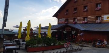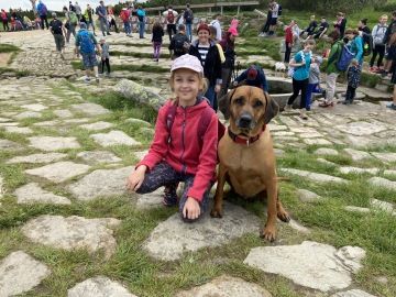 Pokračovali jsme dál. Od Růženčiny zahrádky jsme sestoupili kamenitou cestou pomalu až ke Dvoračkám. Na cestě jsme nepotkali téměř nikoho, a tak se i já mohla pořádně proběhnout. Nejmladšího člena z mé smečky už ale bolely nožičky, a tak se kousek cesty nechal nést. Konečně jsme dorazili na Dvoračky, kde si páníčci dali kus žvance v restauraci Štumpovka. A ani já nezůstala o hladu, dostala jsem sušené ucho, kterému jsem se delší dobu věnovala. Páníci se kochali se krásným výhledem, děti mlsaly něco sladkého a já si na chvilku dopřála malého šlofíčka.
