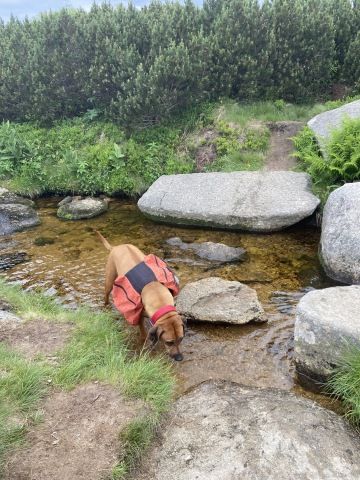 Dál jsme pokračovali přes Labskou boudu s odbočkou k Labskému vodopádu až k Prameni Labe. Děti řádí a běhají všude kolem, jak to jen jde. Je tu docela dost psích kamarádů, ale já si ráda na chvilku odpočinu.