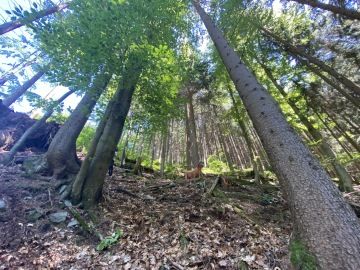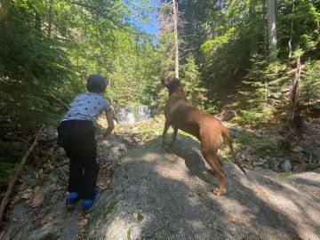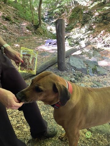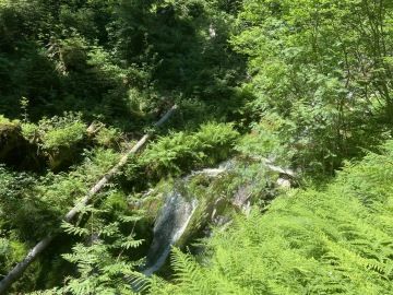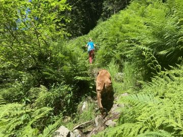 Dalších asi 1,5 km vedla cesta po druhé straně potoka. Přebrodili jsme potok – pro jistotu jsme šli všichni jen po tlapkách, a pokračovali jsme v trošku větším stoupání stále nahoru. Občas užší cestou, občas kapradím. Pár dnů před naším výletem prolétl Krkonošemi nějaký obrovský vítr, tak nám občas zkřížil cestu i spadlý strom. Po cestě jsme míjeli spoustu pramenů, pravidelné občerstvení vodou přišlo v horký letní den vhod. Další, tentokrát Soutěskový vodopád, byl také moc hezký. Po dalším prudším stoupání jsme přešli lávku přes potok a už jsme mířili k červené turistické značce. Dali jsme si svačinku a po Zvonkové cestě jsme už sestupovali z kopce dolů, s nádherným výletem do jánského údolí, po sáňkařské dráze a kousek i po sjezdovce, zpátky k hospůdce Na Formance.