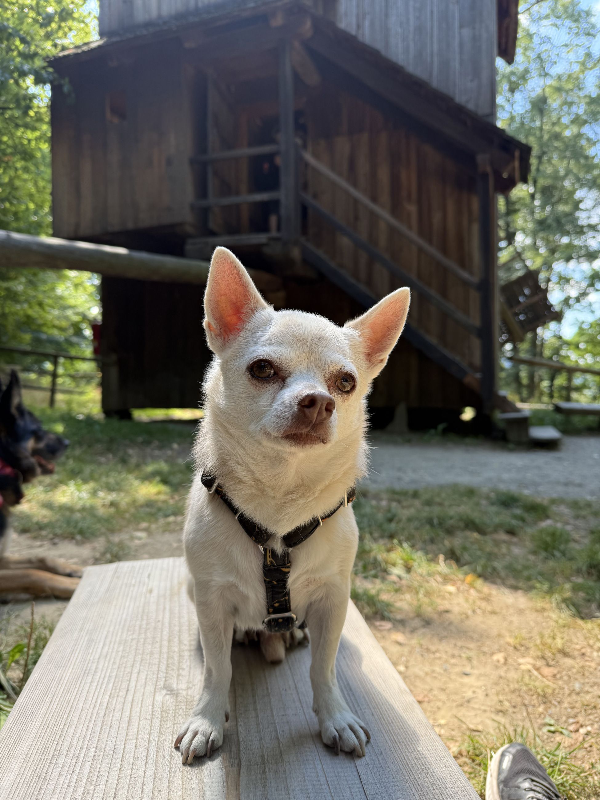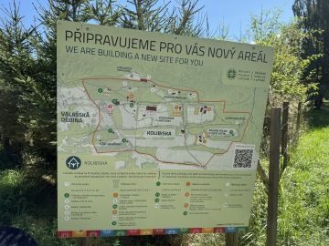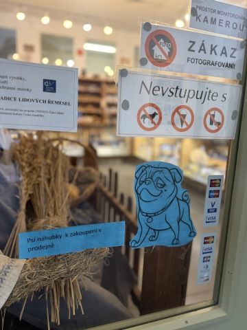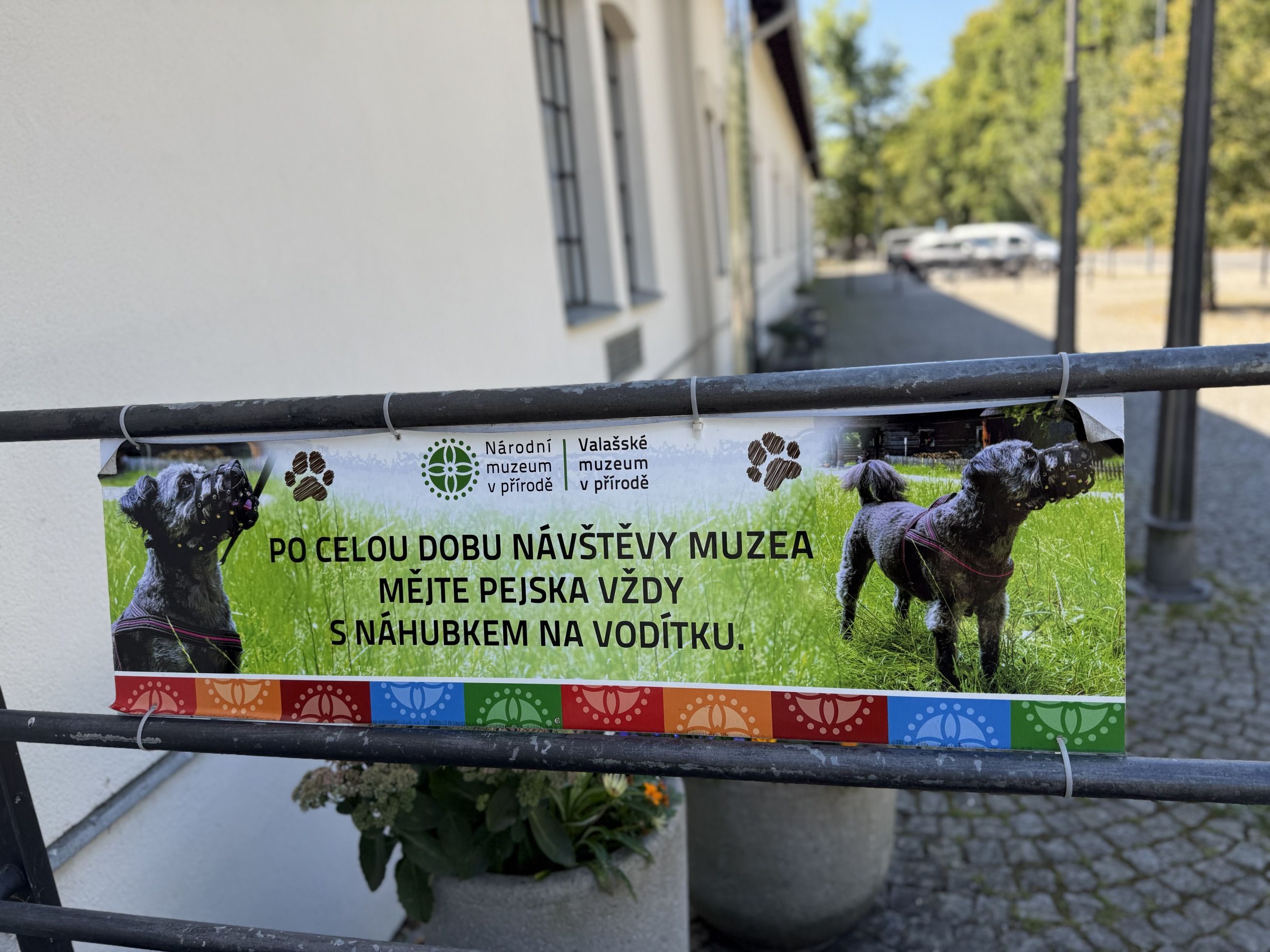 Pejsci do areálu údajně smí jen s košíkem. Nás ale pustili bez košíku úplně v pořádku, ani ceduli tam neměli, jen z druhé strany od silnice se nacházelo upozornění.
