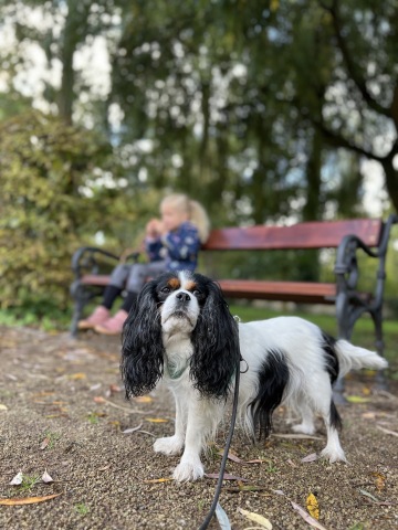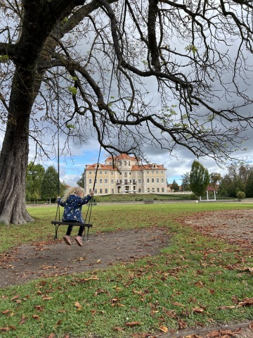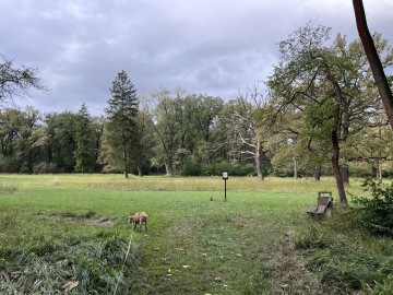 Šli jsme po červeném okruhu a udělali si malou odbočku k zámku. Zespodu žádné zákazy pro nás čtyřnožce nejsou, takže jsme si užívali klidnou procházku. Park je nádherný – vysoké stromy, voňavé listí a na velkém kaštanu visí kouzelná houpačka. Ninuška se na ní houpala, smála se, a já hlídala, jestli nespadne.