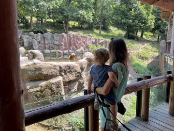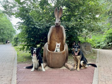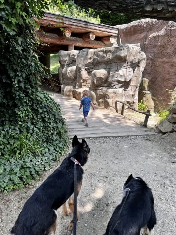 ZOO Brno chová 2 500 zvířat, to tedy nevíme, jestli stihneme vše pročmuchat. Jako první jsme se šli podívat na lišky a bahňáky, ale asi odpočívali, tak jsme zamířili k vlkům, kde byla krásná indiánská chýše. Tady se páníčci lehce ztratili, ale nám to vůbec nevadilo, čmuchali jsme spoustu nových vjemů. Od vlků jsme se vrátili kousek zpět a ocitli jsme se u medvěda, chvíli jsme ho sledovali a pak pokračovali v cestě. Odtud nás čekala ta horší část, dlooooouhý kopec nahoru. Jezdí tu mašinka, ale páníčci řekli, že půjdeme po svých. Alespoň jsme ale viděli surikaty, alpaky, klokany a spoustu dalších zvířátek.