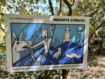 Prostředí je hodně přírodní, člověk si chvíli připadal jak v lese. Po cestě do další části jsme potkali cedule, kde bylo psáno, co je v Zoo žádoucí a co naopak ne. Já jsem ale slušnej kluk a všechno jsem měl samozřejmě za jedna.