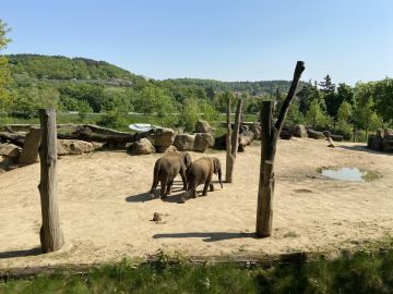 Po chvilce cesty mi panička říká, že mám za plotem příbuzné - prý nějaké vlky. Mě ale mnohem víc zajímají sloni, co bydlí hned naproti. Vydržím je soustředěně pozorovat několik minut, pak mě ale vyruší nějaké děti. Tak se taky podívejte, no…